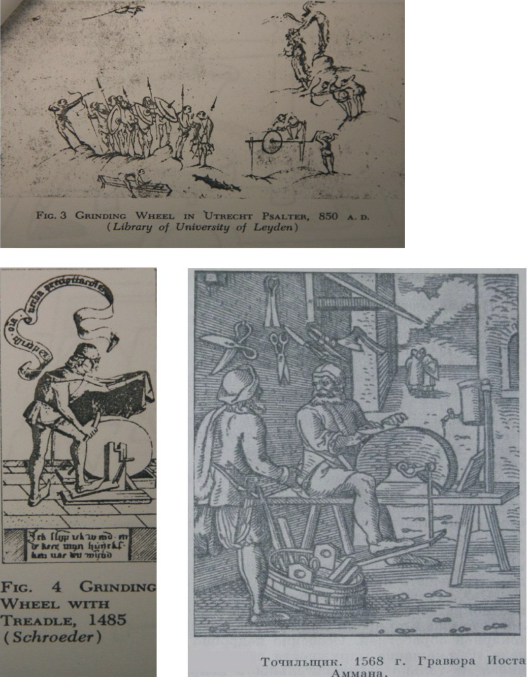 С появлением первого кустарного производства в 5-6 веках шлифование и полирование стали его частью. Первые абразивные станки это приспособления с лучком для добывания огня плавно перешедшие в сверление каменных топоров а также планшайбы гончаров и мельницы мукомолов.